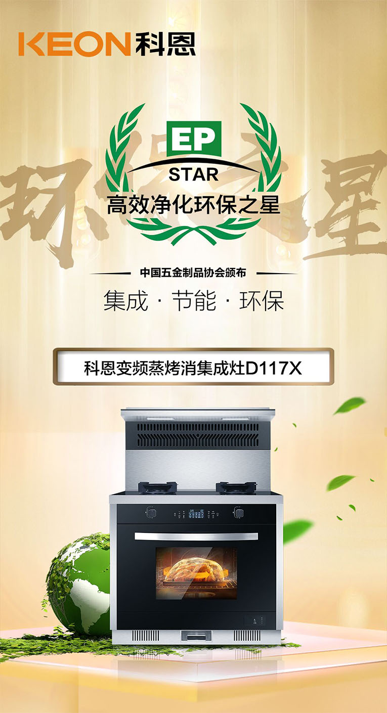 科恩D117X集成灶在眾多品牌中脫穎而出,斬獲由中國五金制品協(xié)會(huì)頒發(fā)的2020年中國集成灶“高效凈化環(huán)保之星”。