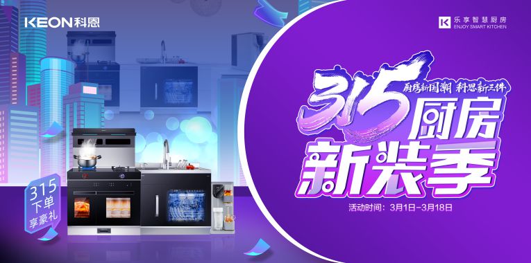 春季廚房換新裝,不妨考慮進集成灶十大品牌、廚電行業十大品牌科恩集成灶全國各大專賣店,科恩廚房新國潮,科恩新三件,315廚房新裝季活動火爆進行中,下單享8大壕禮,為用戶提供更多樂享智慧廚房新選擇,從此愛上廚房!