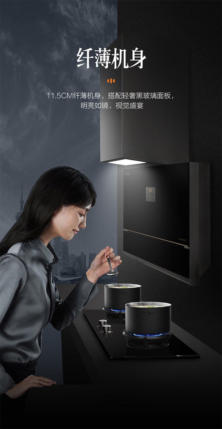 廚房環境要將就?絕不同意!高顏值的廚房離不開高性能的廚電搭配,集成灶十大品牌、廚電行業十大品牌科恩新一代大吸力煙機7350,大吸力,不跑煙!整機采用輕奢黑晶玻璃面板,11.5cm纖薄機身,搭配大寬屏柔光照明,烹飪視野更加開闊,無需低頭就能分辨調味料,盡情享受廚房的聚光燈。
