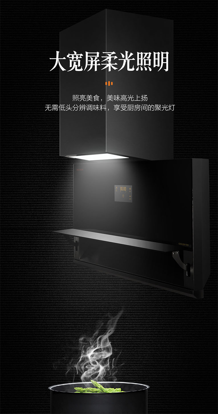 上方采用大寬屏柔光照明,發光均勻無暗影,照亮美食,美味高光上揚,無需低頭分辨調味料,享受廚房間的聚光燈。