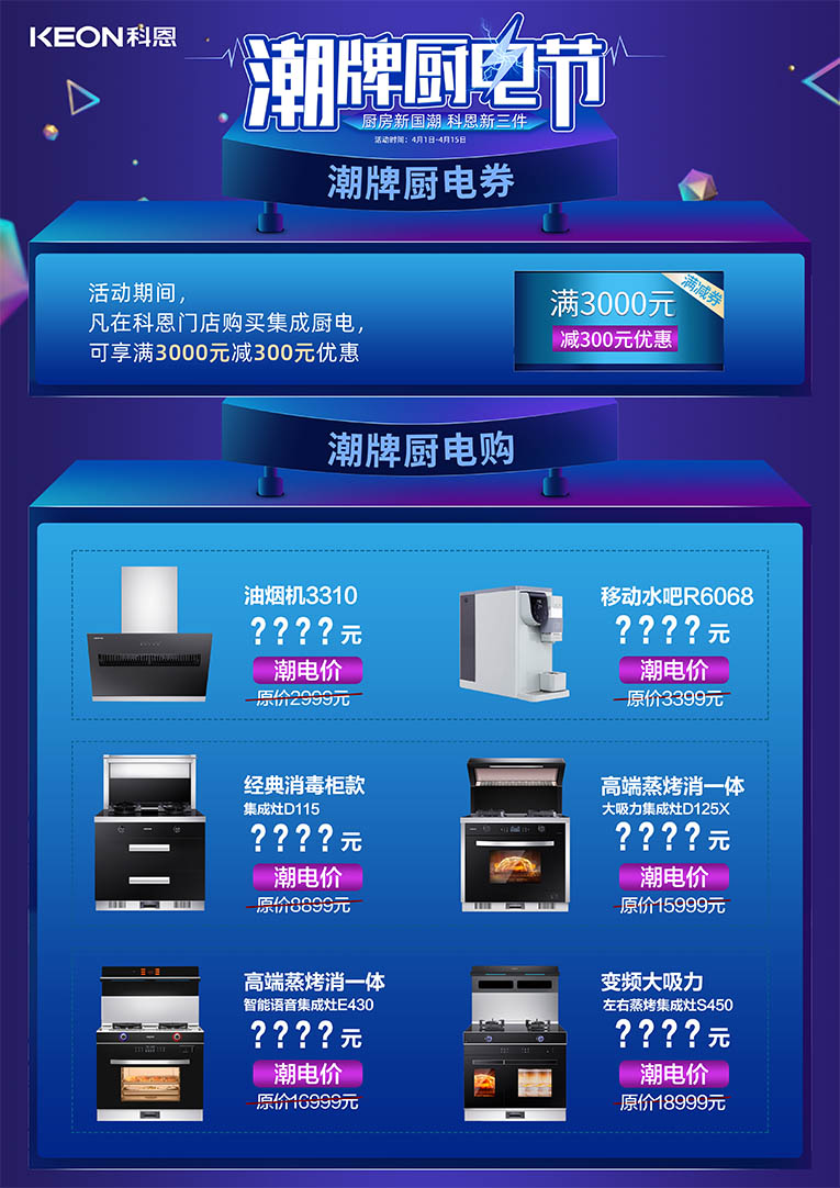 除此之外,更有科恩全國六大戰區同時發力,只為給全國用戶帶來瘋狂特惠!!4月1日——4月15日,進科恩門店,潮牌廚電節,更多驚喜等你揭秘~