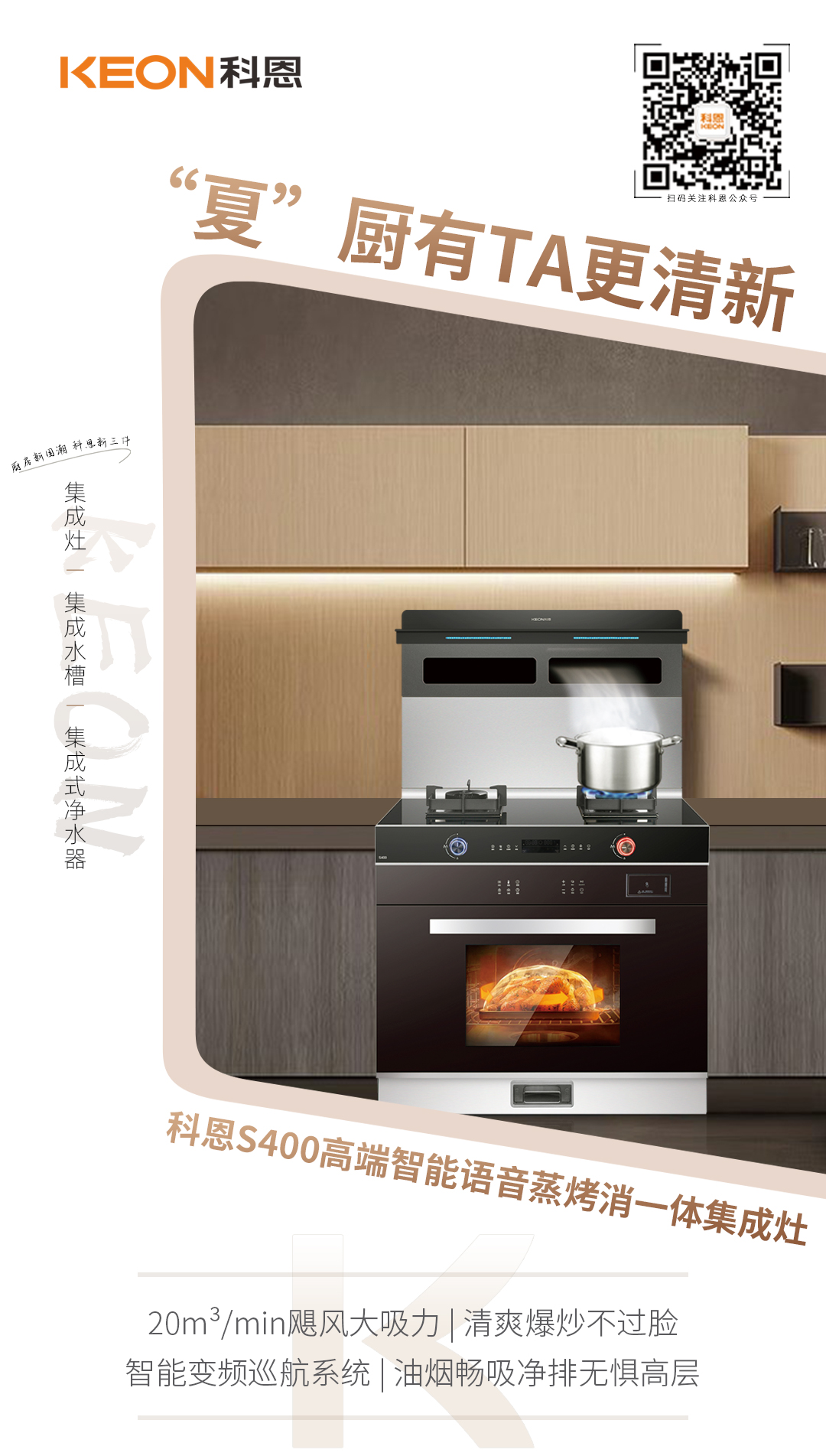 每一次下廚時的揮汗如雨,都是對愛的最好詮釋!科恩S400高端智能語音蒸烤消一體集成灶,20m3/min颶風大吸力,720Pa大風壓,瞬吸惱人油煙,清爽爆炒不過臉,當熱浪遇見清風,悶熱煩躁一吹就散了,只留下如春風細雨般溫然如潤,智能變頻巡航系統,化身“斗暑圣戰士”,油煙暢吸凈排,無懼高層,烹飪高峰亦可游刃有余,于酷暑中守護家人的一日三餐!