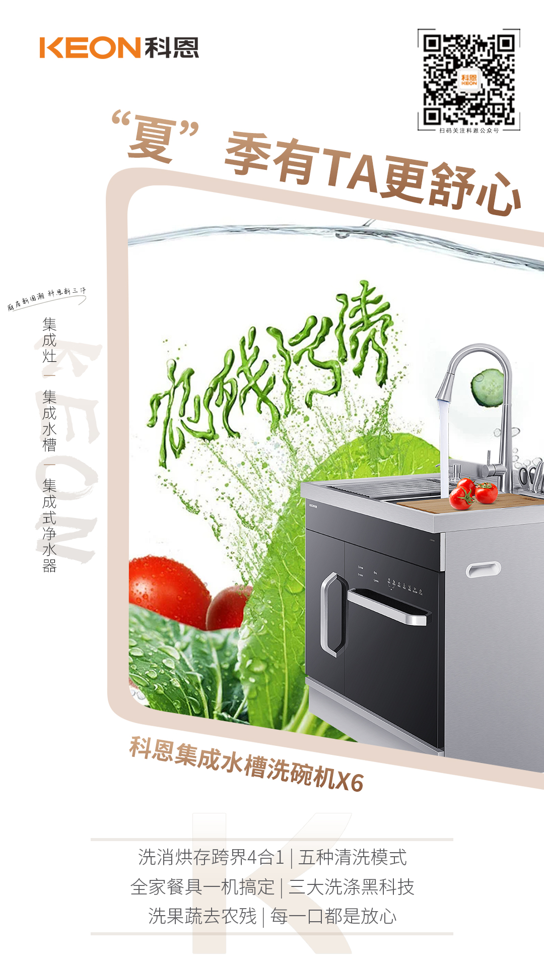 阻止我廚藝增長的主要原因,大概是夏季炎熱的廚房和四季不想洗碗的手,如今“夏”廚有了科恩S400蒸烤一體集成灶,再加上科恩集成水槽洗碗機X6的坐鎮,連廚房都變得有趣了起來!跨界4合1洗消烘存,把刀架、900mm寬體多功能超大水槽、洗碗機、儲物柜等集成一體,空間更優化,5大清洗模式、多種洗滌場景一機搞定,雙層靈活碗籃輕松滿足五口之家十套餐具清洗存儲,湯鍋、炒鍋等大件廚具也能輕松洗滌;更有特制潔凈果蔬洗功能,可清洗葡萄、青菜等果蔬,高效去農殘,還可清洗生蠔、螃蟹等復雜海鮮!如此配置的廚房,不僅給生活增添了無限情趣,就算來再多客人都不帶怕的!