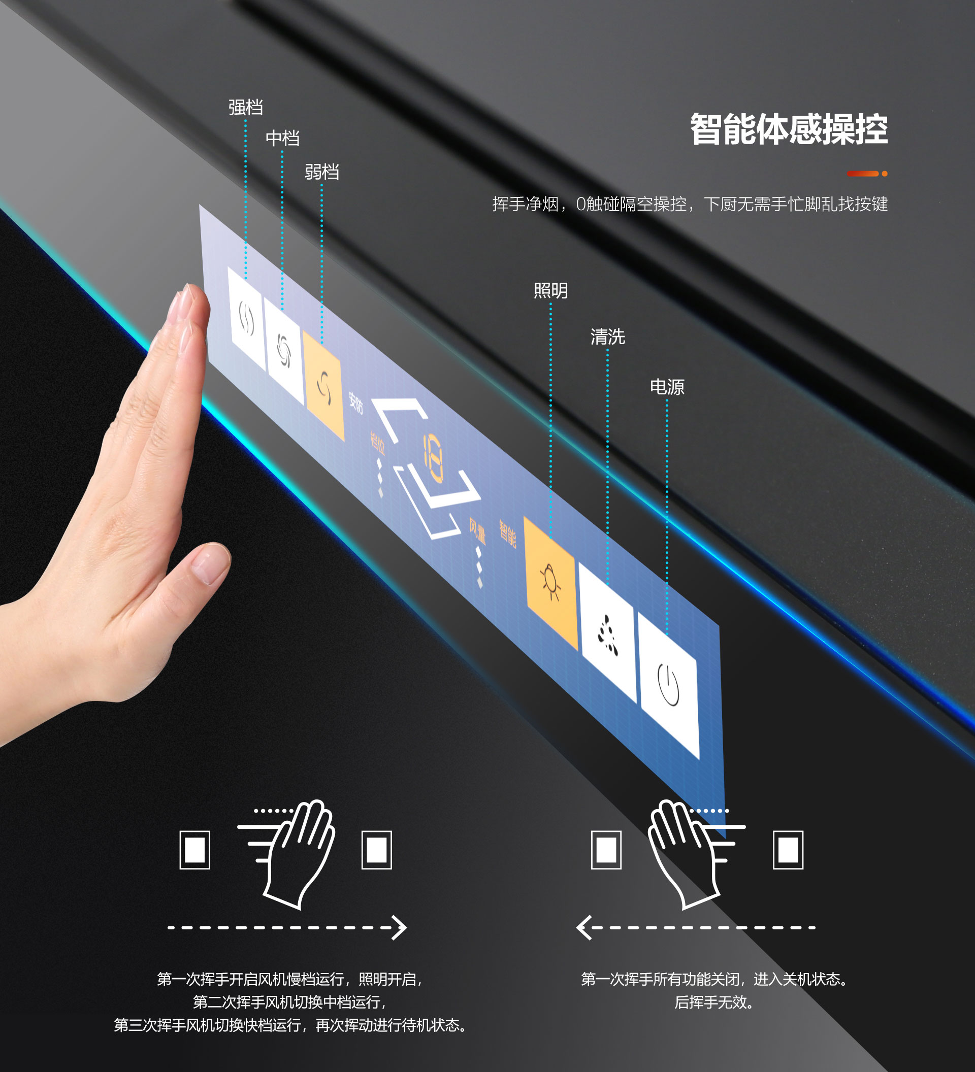 ◆智能體感操控系統(tǒng),無(wú)需觸碰煙機(jī),揮手凈煙,告別繁瑣清潔步驟,更能有效避免手濕油膩導(dǎo)致的觸控不靈敏問(wèn)題,煙機(jī)不留油污、手印,面板時(shí)刻干凈免潔!