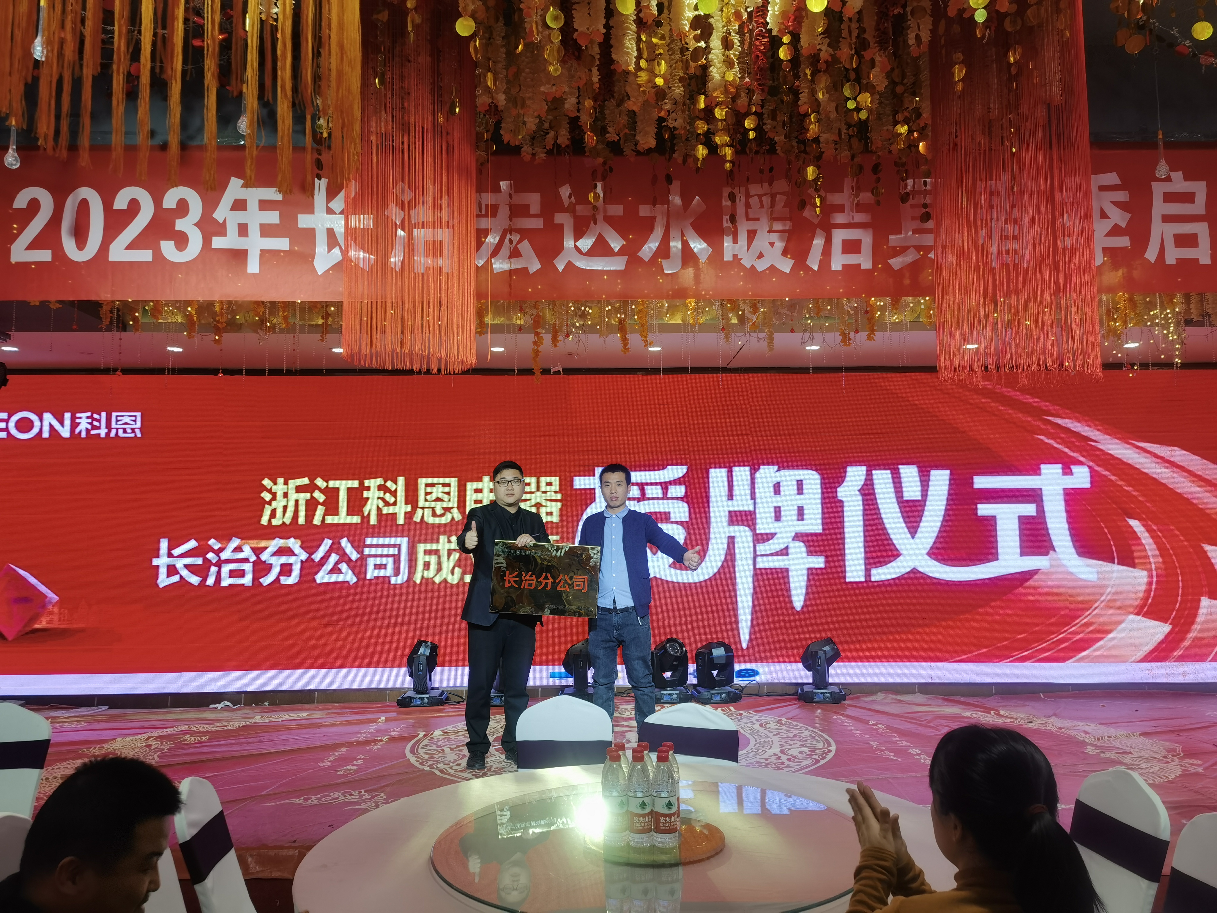 訂貨會上在,浙江科恩電器有限公司山西區域銷售總監陳燊良,代表科恩公司授予長治專賣店“科恩長治分公司”榮譽。長治分公司是科恩第三家區域分公司,是科恩強終端、鑄大商道路上又一里程碑!