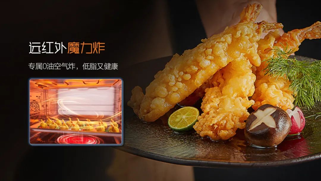立體勻烤:頂部環形加熱管+循環風機+底部隱形加熱管,360度無死角烤制讓食材均勻受熱外酥里嫩烤的更專業。