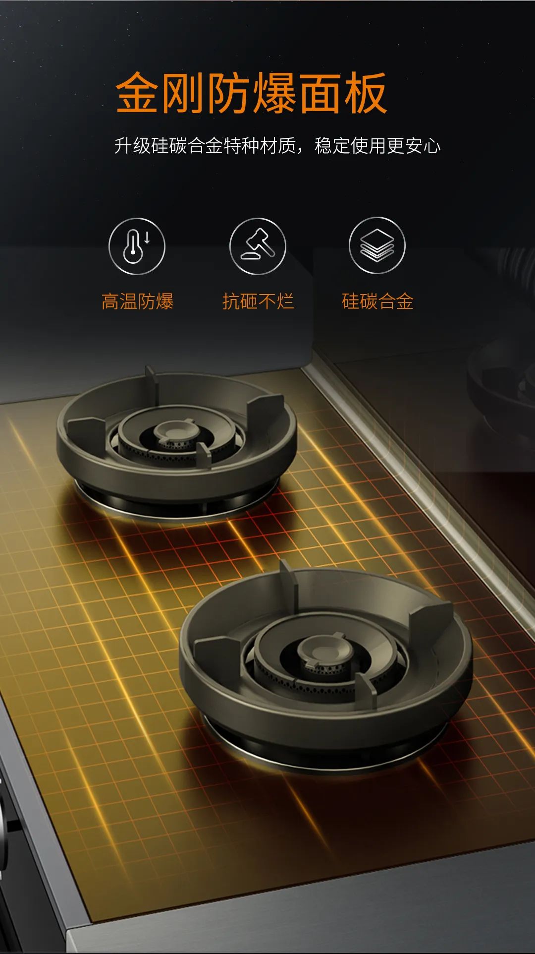 6K省心超體驗一:抗砸防爆耐高溫,安全省心!防爆免清洗集成灶采用防爆金剛板解決廚房安全隱患!硅碳合金特種材質可耐高溫1500℃,高于國標3倍以上,更安全!