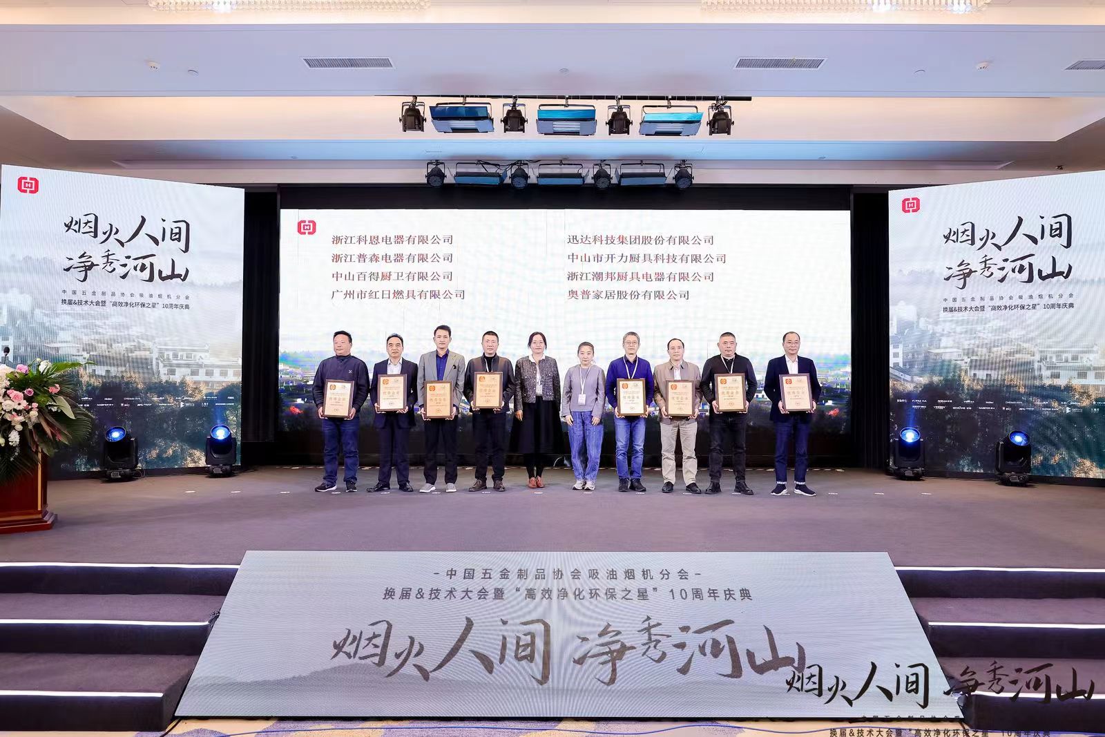 2023年11月28日,主題為“煙火人間 凈秀山河”有中國五金制品協會召開的“中國五金制品協會吸油煙機分會·換屆&技術大會暨‘高效凈化環保之星’10周年慶典”在杭州隆重舉辦。會上發布了獲得本屆“高效凈化環保之星”的優秀企業,并向多年來連續參與此項目并表現突出的企業給予了嘉獎。科恩再一次榮獲“中國五金制品協會-理事單位”及“中國集成灶推動落實國務院《大氣污染防治行動計劃》-優秀企業”!