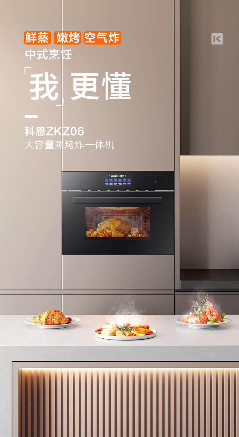 科恩ZKZ06嵌入式蒸烤一體機能夠完美地融合于家居裝飾之中。隱蔽式安裝方式,使得整體廚房布局更為整潔有序,同時,獨特的外觀設計既典雅大方,又具現(xiàn)代感,能為整個家居空間帶來濃厚的藝術氛圍。