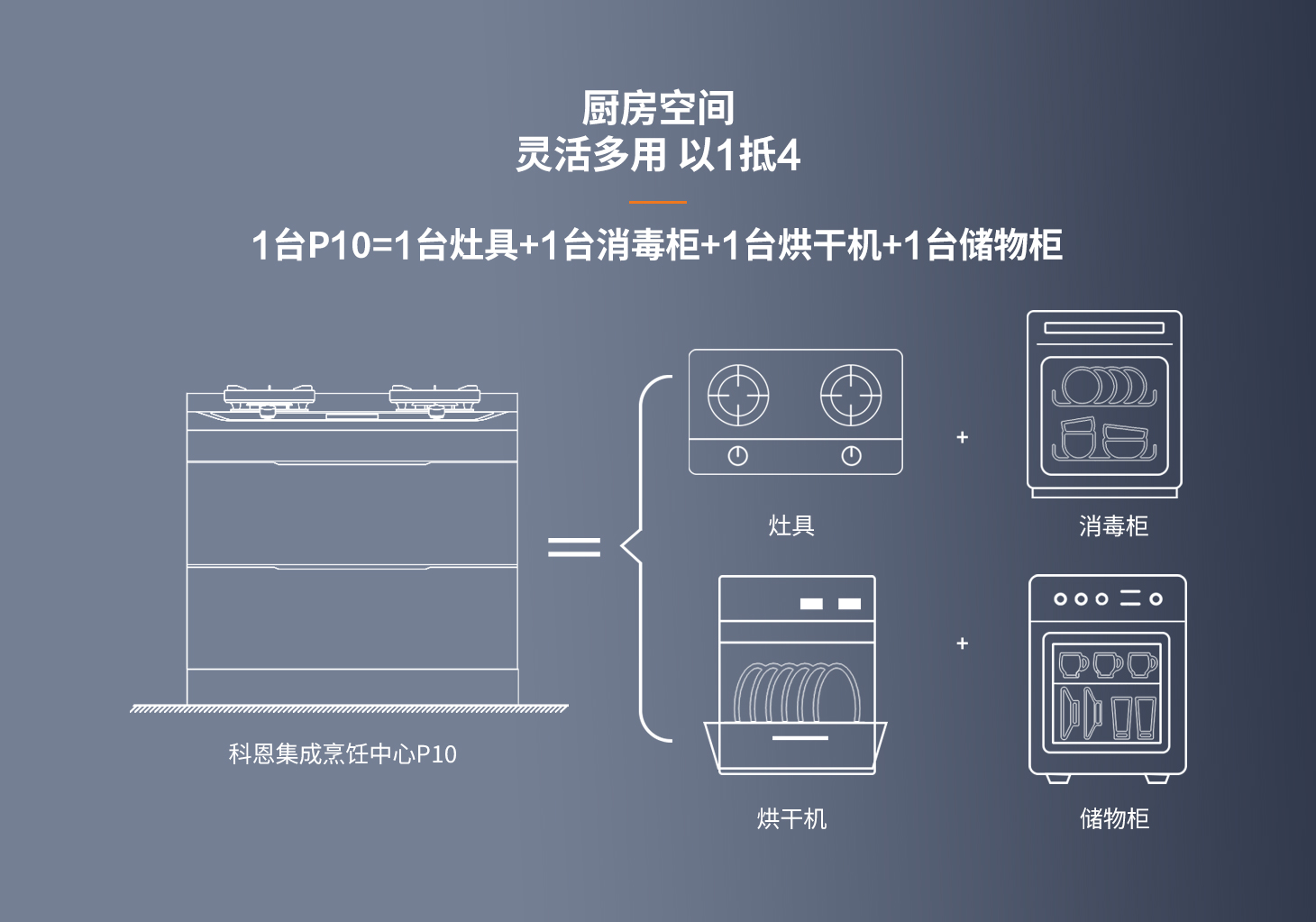 空間革命,小戶救星。告別傳統廚房束縛,解決刻板安裝限制。科恩新品集成烹飪中心p10,0.5個立方,化繁為簡。空間釋放,不占櫥柜空間;主柜清爽,不積油免清洗,上烹下凈,立體空間全能集成。