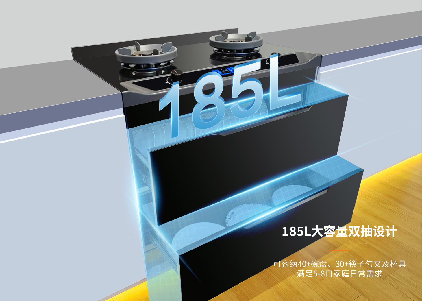 全域消殺,健康護航。避免餐具二次污染,呵護全家人健康安全。科恩集成烹飪中心,185L大容量消毒艙體,紫外線+臭氧+紅外三重消殺。奶瓶餐具統統立體滅菌,二星級認證看得見的安全!