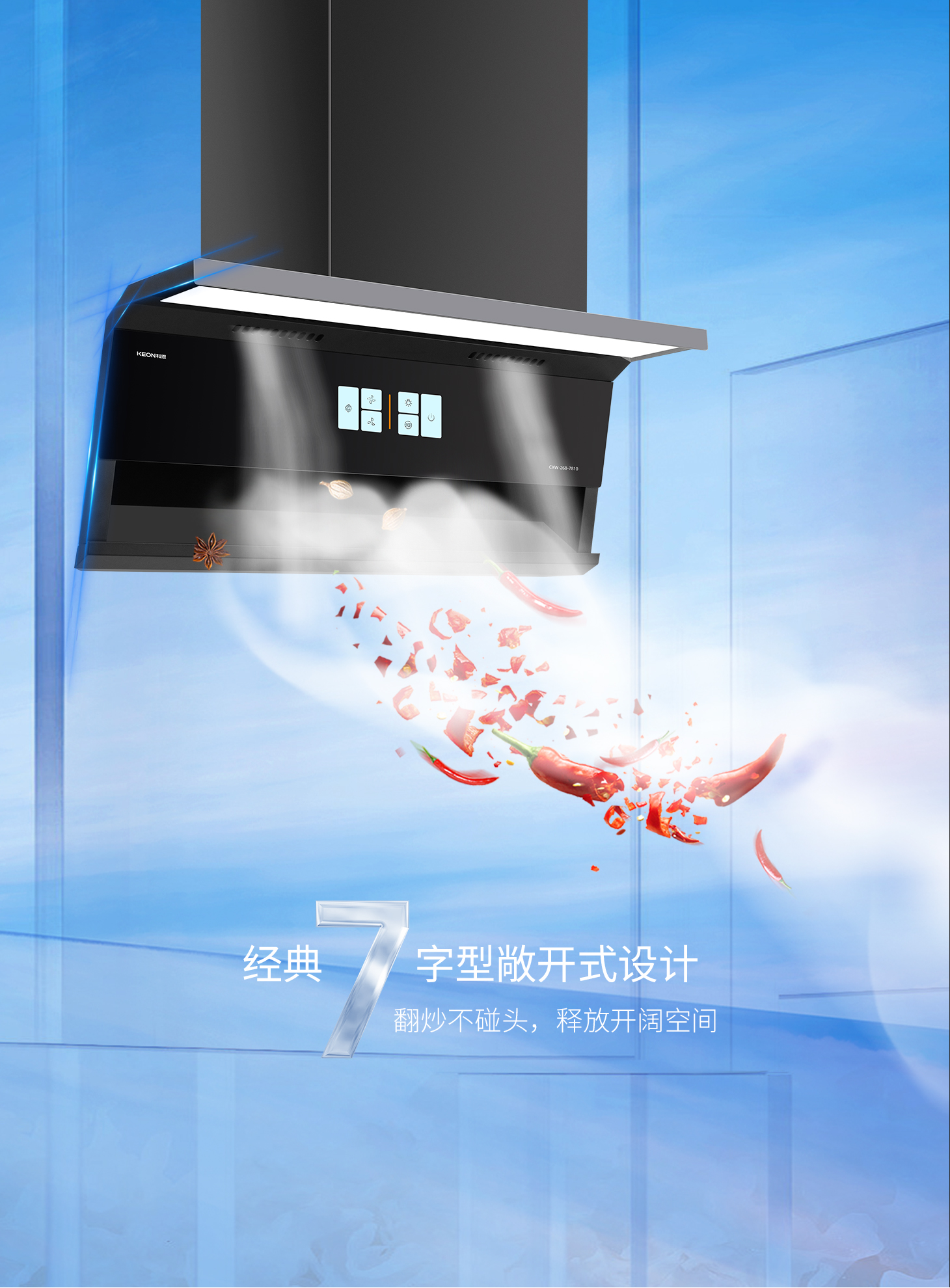 定義空間優雅美學,2.5cm超薄機身+7字型敞開式,顛覆傳統煙機厚重印象。0.1立方敞開式大空間,翻炒再也不用擔心碰頭煩惱,帶你沉浸式體驗烹飪樂趣!模塊化觸控鍵流轉金屬光澤,指尖輕點即響應,更有揮手智控模式。讓油膩指紋告別煙機表面,在煙火里感受從容自由。
