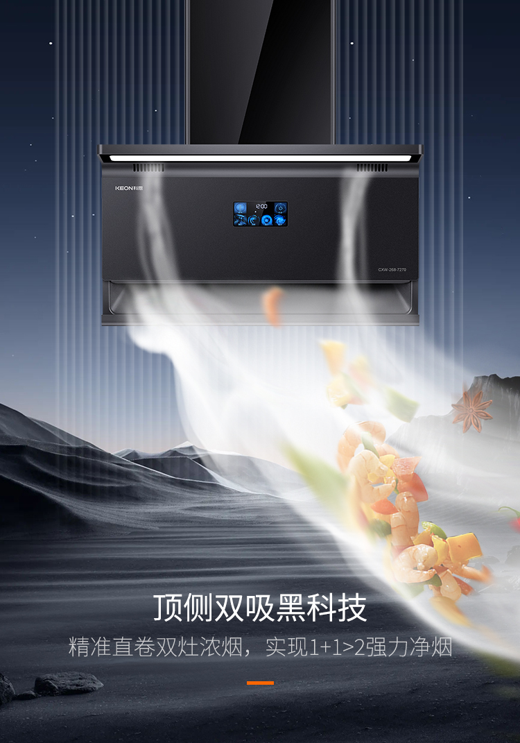 頂側雙吸的設計,精準直卷雙灶濃煙,實現 1+1>2 的強力凈煙效果。25m³/min 大吸力,無懼中式爆炒,895×468mm 超寬屏攏煙,全方位覆蓋雙灶,讓油煙無處可逃。三檔風量隨心調節,無論是小火慢燉,還是大火爆炒,都能一鍵匹配最佳吸力,7270煥新廚房清新空氣。