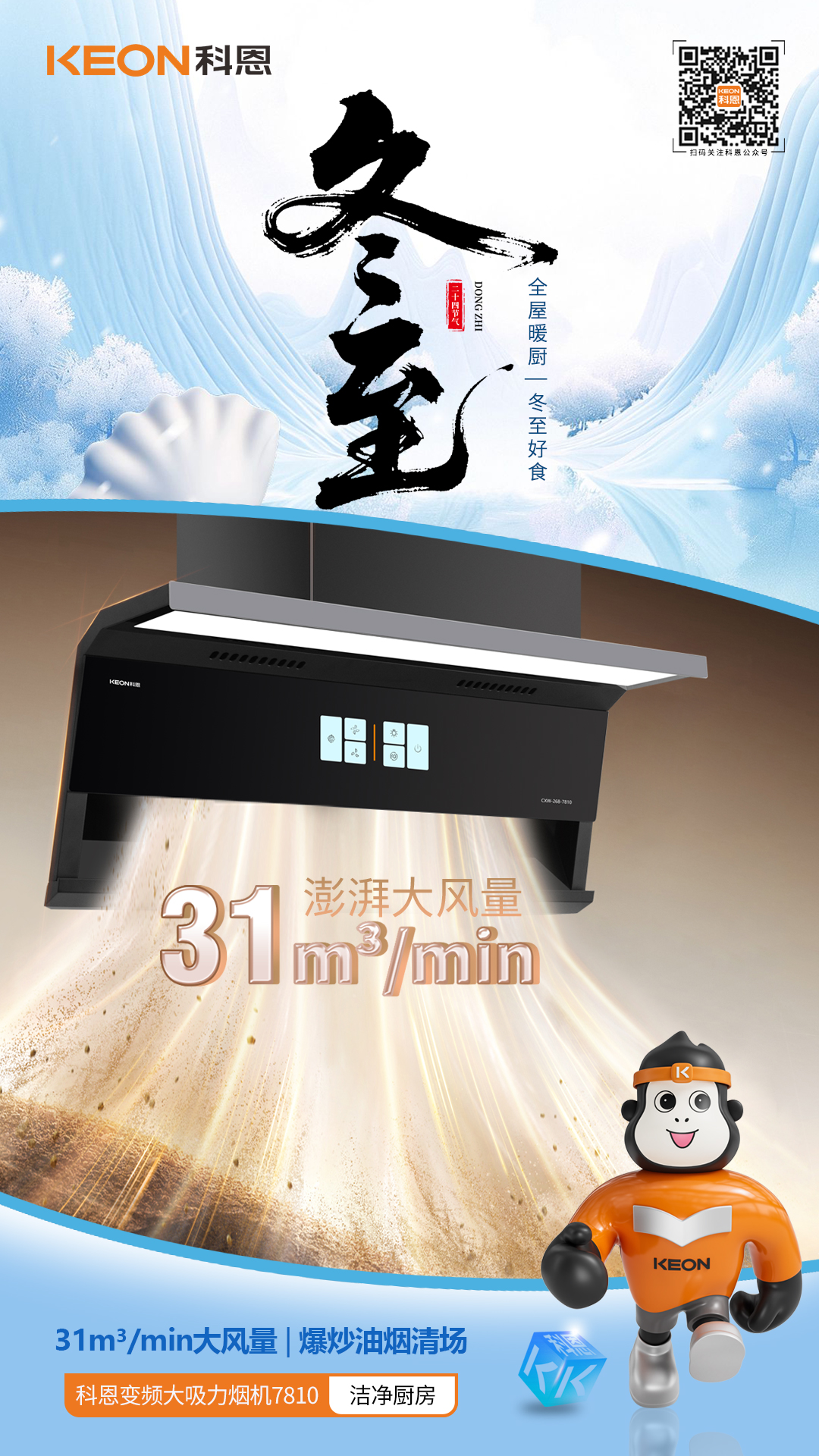 強吸凈煙,灶間清爽。冬至爆炒,油煙肆虐。科恩7810煙機就位,瞬鎖油煙31m³/min 澎湃風量3秒清場功力,天鵝頸設計,釋放操作空間,揮手智控啟停,告別油膩觸碰全域攏煙,讓烹飪回歸優雅纖薄高顏,智洗省心冰川灰鑲邊,適配各式廚裝,特氟龍涂層,油污一擦即凈搭載智旋自清潔,持久強勁吸力,全景護眼大燈,烹飪視野明朗延時排煙設計,余味一掃而空老廚煥新,無需大動干戈