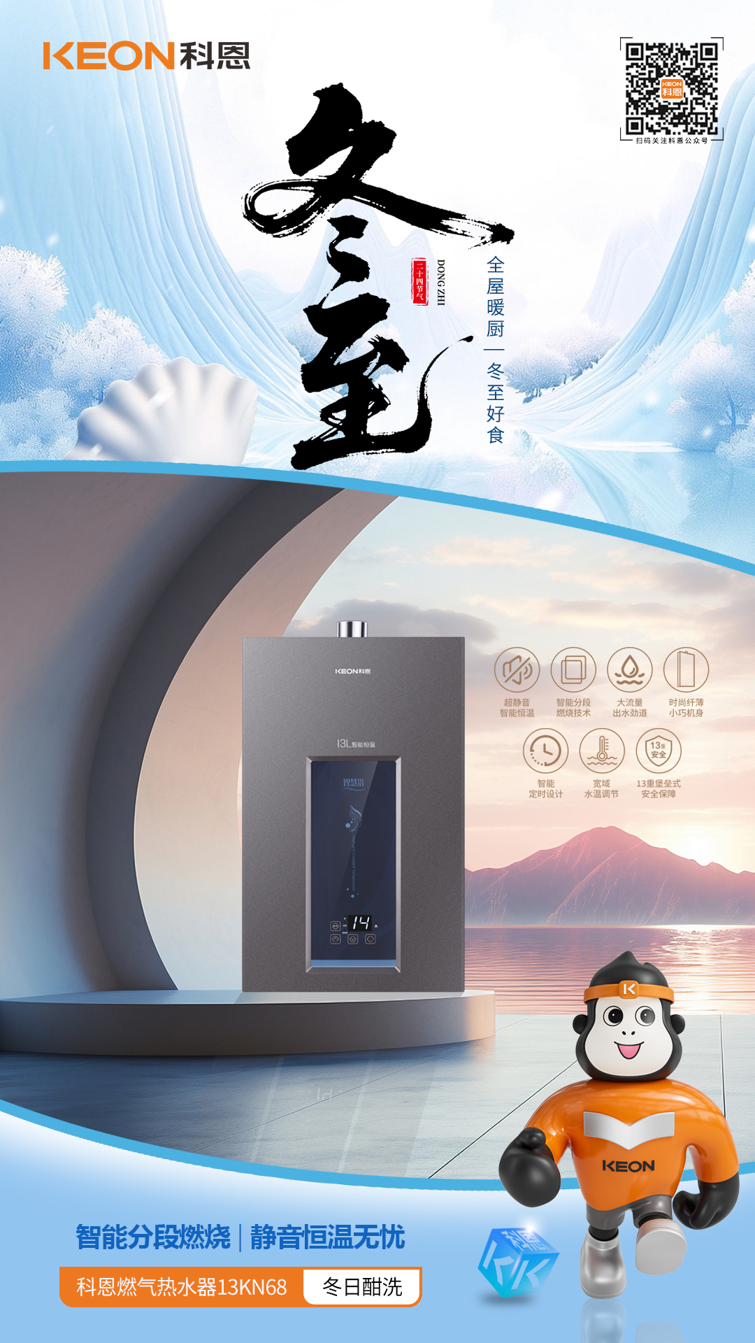 恒溫暢浴,暖徹心扉冬至寒深,沐浴需暖意加持,13KN68熱水器,全域熱水自由,智能恒溫技術,水溫精準恒定,大流量速熱,瀑布浴感即刻享,超靜音運行,靜謐不擾休憩高級灰機身,顏值適配家居安全護航,舒適無憂。分段燃燒技術,節能高效制熱,13重安全保障,全天候守護,低壓啟動設計,高層老房適配,智能定時關機,貼心提醒通風無氧銅水箱,環保熱效出眾,寒夜沐浴,暖意直達心底。