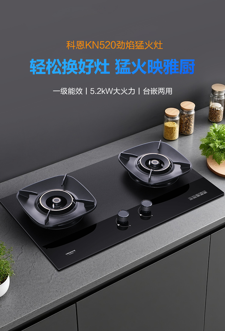 安全省心,長效耐用。意外熄火保護,火滅氣斷無隱患。航空級燃燒系統,抗腐不變形更持久??刹鹦恫考O計,清潔維護超簡單。70%新標能效,節能環保雙達標。鋁合金爐頭防堵防銹,使用壽命再延長。日常烹飪放心用,省心耐用無煩惱。煥新正當時,煙火更舒心。新標換灶選科恩,健康節能雙保障。KN520雅廚適配,KN530格調升級。無煙烹飪自由呼吸,省氣省心更安心。告別老灶痛點,讓烹飪回歸從容愉悅,科恩雙款新灶,守護全家三餐溫香!