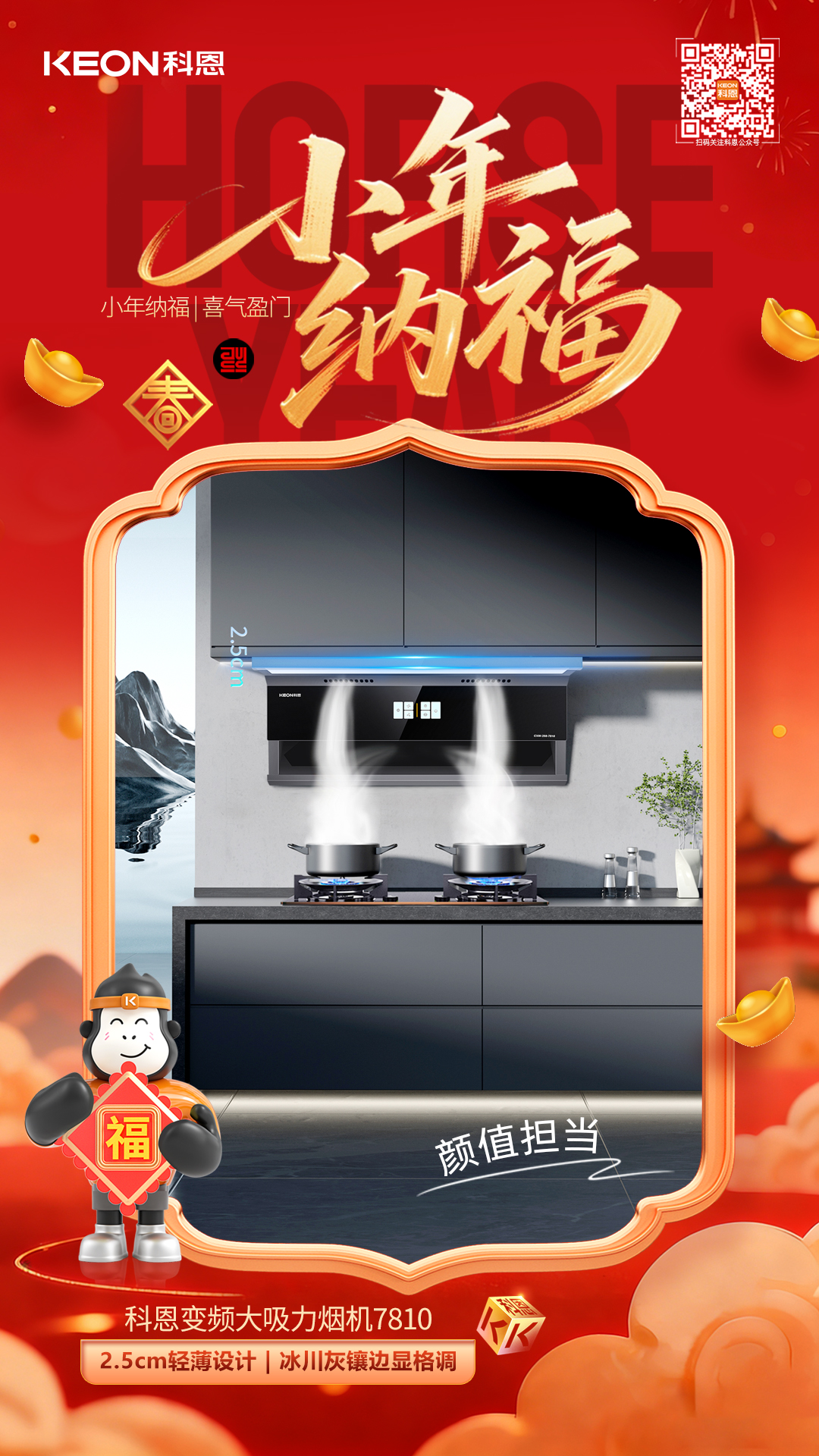科恩7810煙機(jī)以美學(xué)設(shè)計(jì)賦能廚房升級(jí),2.5cm 輕薄機(jī)身搭配冰川灰鑲邊,天鵝頸弧度勾勒雅致線條,讓煙火之地亦成顏值擔(dān)當(dāng)。揮手智控免去油膩觸碰,三檔風(fēng)力適配蒸燉煮炒,延時(shí)凈煙守護(hù)呼吸健康,將便捷操作與健康理念融入小年每一刻烹飪時(shí)光。
