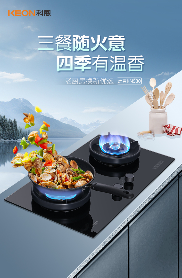 煥新廚房,溫享三餐。新標之下選好灶,KN530全維適配,顏值與實力并存,安全與節能兼顧,適配各類廚房布局,輕松煥新無負擔,選擇科恩KN530,烹飪自此更從容,廚房煥發全新活力。