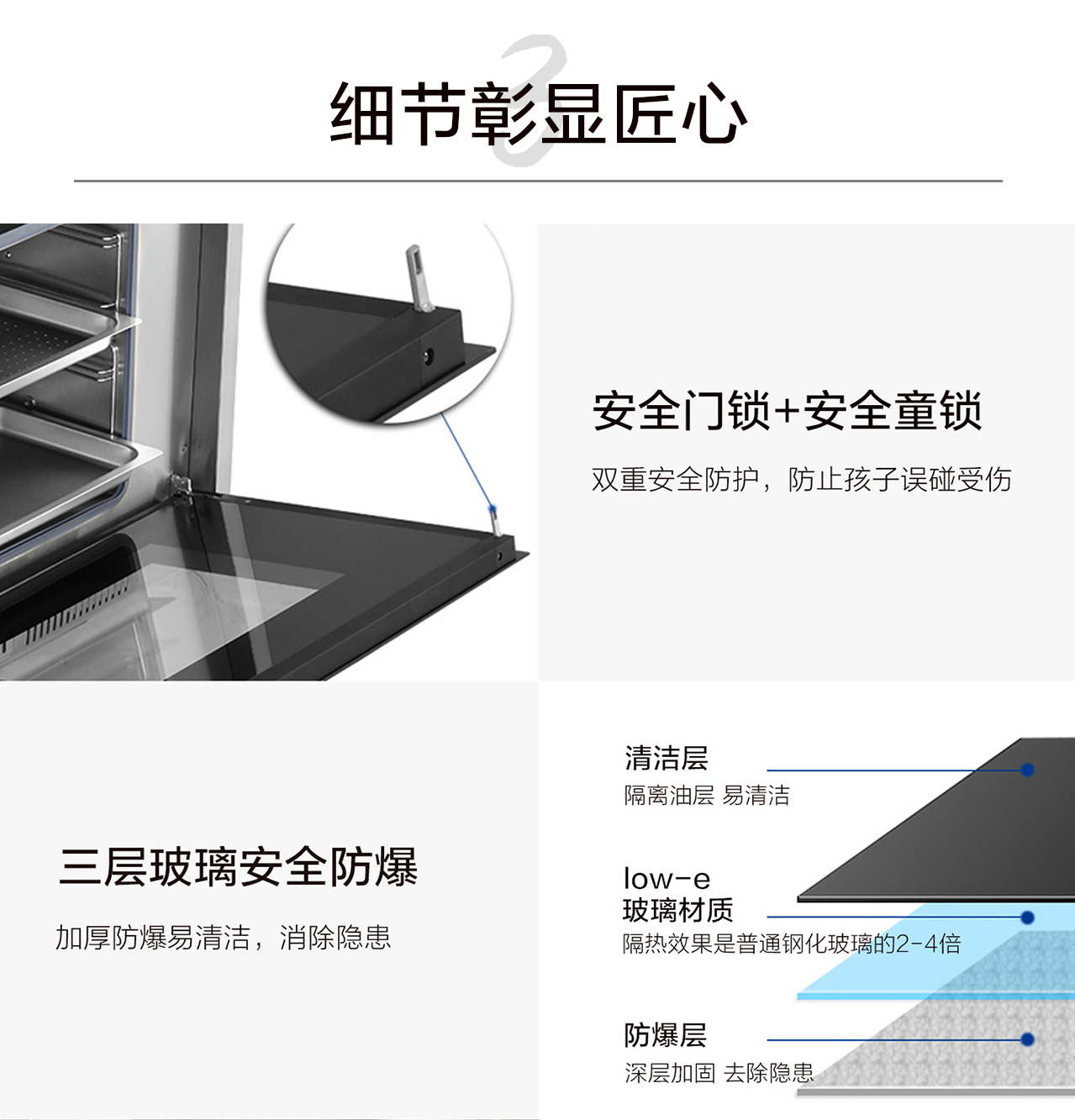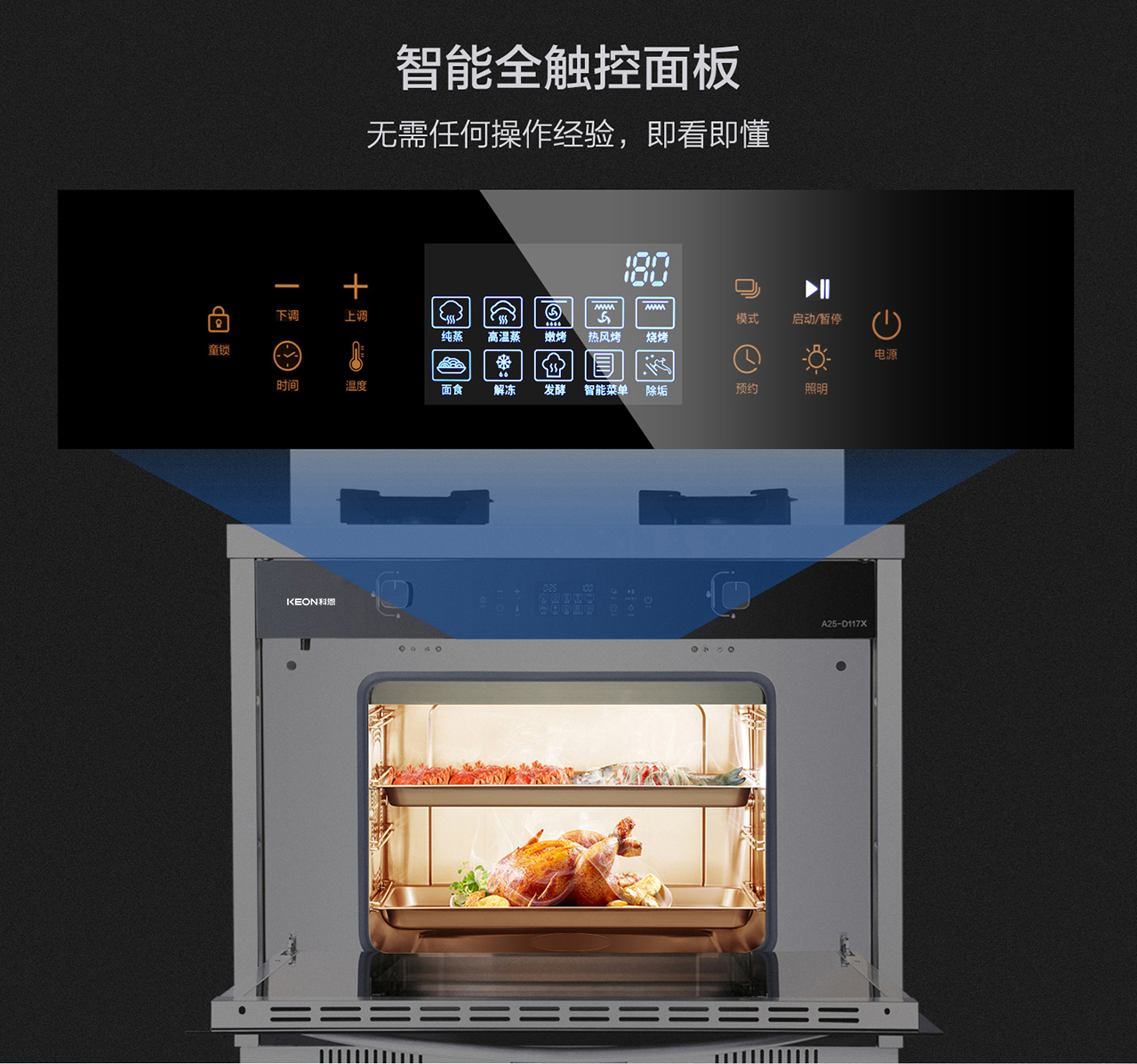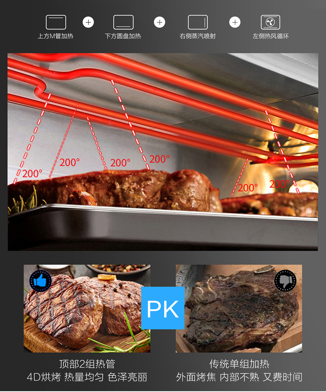 62L大容量食品級(jí)304不銹鋼內(nèi)膽,上下4層設(shè)計(jì),9種蒸烤模式。