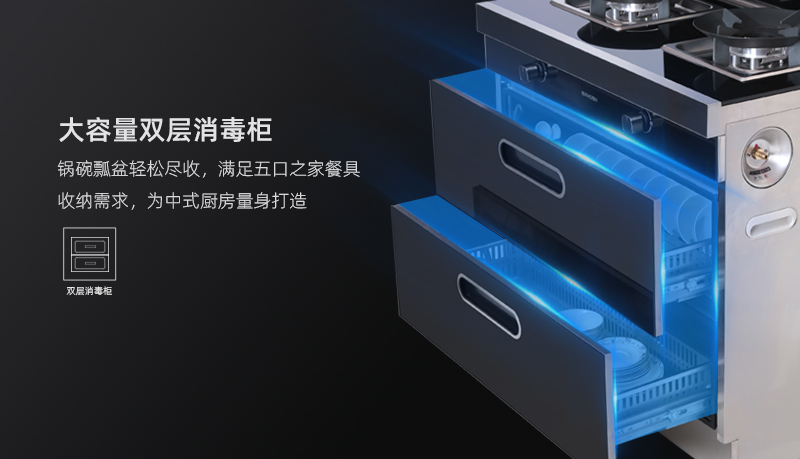 大容量雙層消毒柜,鍋碗瓢盆輕松盡收,臭氧+紫外線雙重消毒,深層殺死細菌