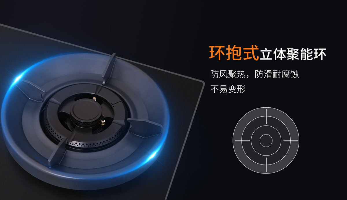 - 環抱式立體聚能環,防風聚熱,提升熱效