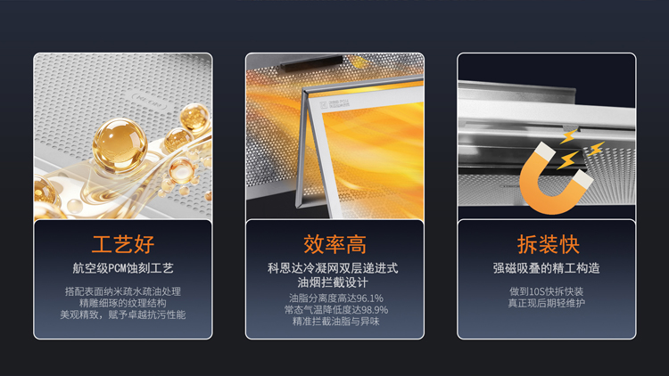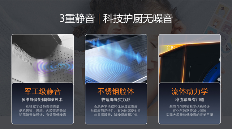 - 軍工級靜音消聲巢,多維靜音矩陣降噪,靜享烹飪