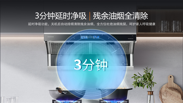 - 3分鐘延時凈吸,殘余油煙全清除,呵護家人呼吸健康