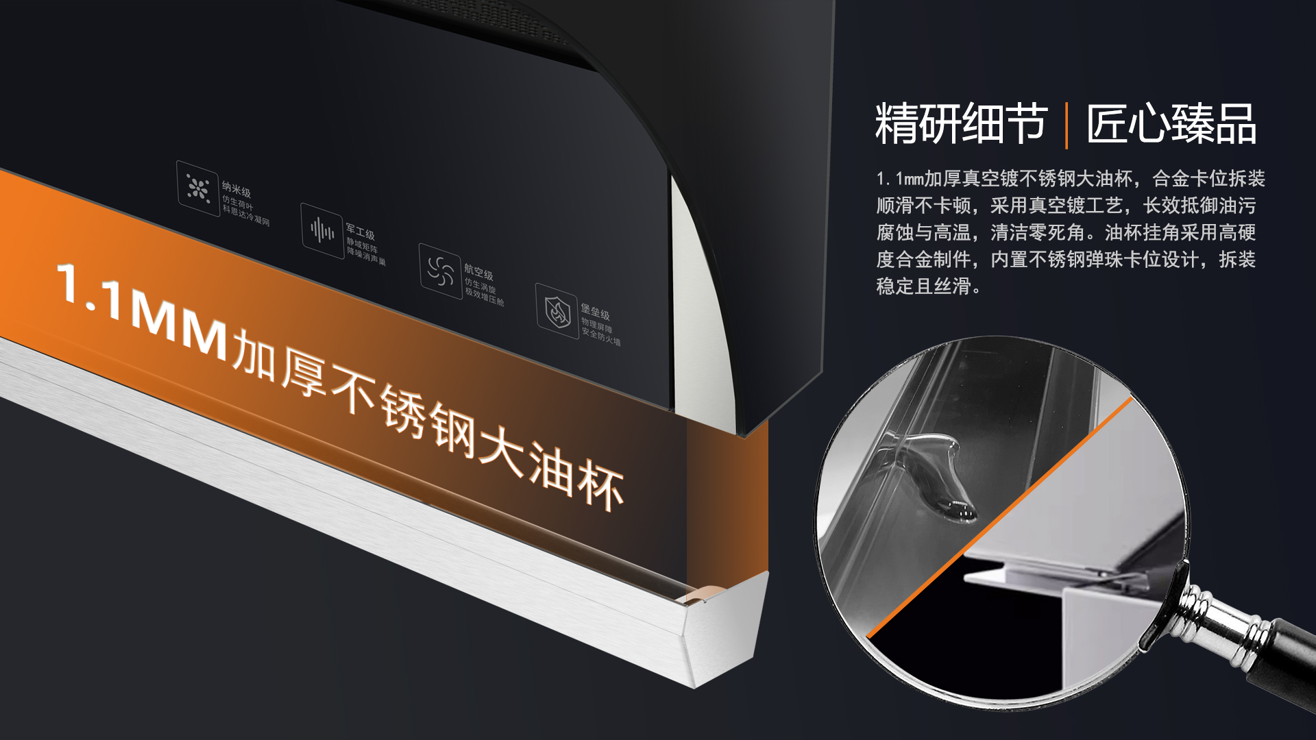 - 1mm加厚不銹鋼大油杯,卡位牢固,真空鍍工藝,清洗便捷